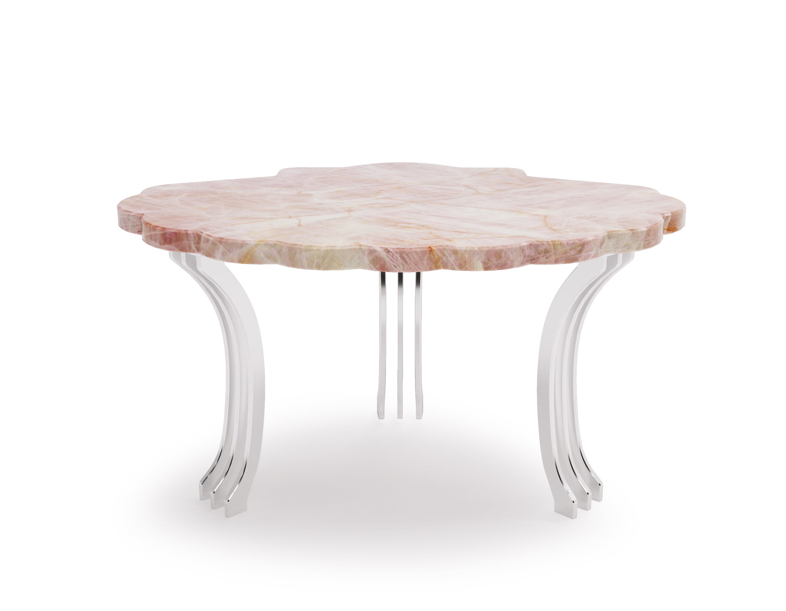 Seria Scallop to figlarne połączenie subtelności natury i wyrafinowanej elegancji minionych epok. Blat wykonany z kwarcytu ma kształt muszli małży św. Jakuba i roztacza aurą lekkości i delikatności.